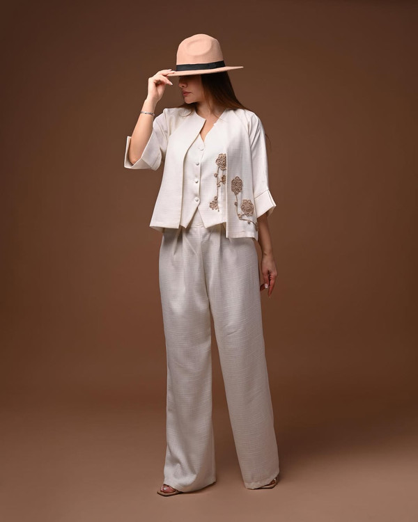 کت و شلوار و جلیقه با پارچه سفید زری دار با گل قلاب بافی